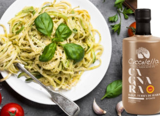 Ingredienti per 4 persone Quantità Spaghetti n.5 320 gr Zucchine 3 Pomodorini ciliegini 15 Cipolla 1 Basilico 6 foglie Mandorle pelate a scaglie 1 cucchiaio Olio Extra Vergine di Oliva Cagnara DOP 3 giri La ricetta Una spaghettata tra amici all’ultimo momento? Eccone una buona variante con le zucchine e olio extra vergine di oliva...