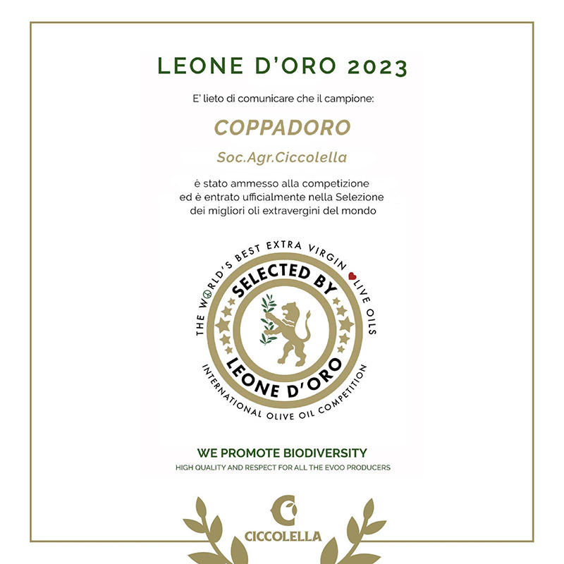 Anche quest’anno il nostro Coppadoro è stato ammesso al Concorso Leone d’Oro Leone d’Oro International, una tra le più antiche e selettive competizioni internazionali, entrando ufficialmente nella Selezione dei migliori oli extra vergine al mondo.