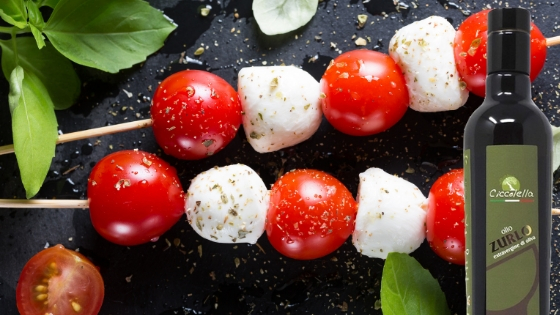 Mettiamo un pizzico di sale e origano sulle mani e “accarezziamo”ogni spiedino poi, girandolo su se stesso in un piatto dove avremo messo un giro di olio extra vergine di oliva Ciccolella fruttato delicato, “coloriamolo di Zurlo”.